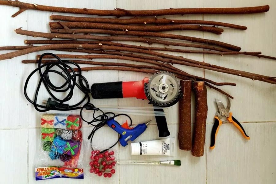 Bước 1: Cắt gọt bớt các cành nhánh nhỏ rồi chặt khúc cây thành những đoạn dài ngắn để làm tán cây thông.
