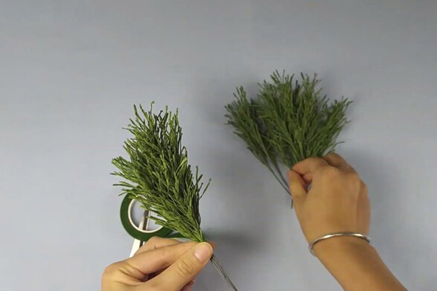 Bước 5: Sau khi có những nhánh thông rồi thì bạn sẽ ghép lại thành thân cây. Bạn ghép từ đáy lên chóp, cố định lại chắc chắn bằng sợi kẽm.