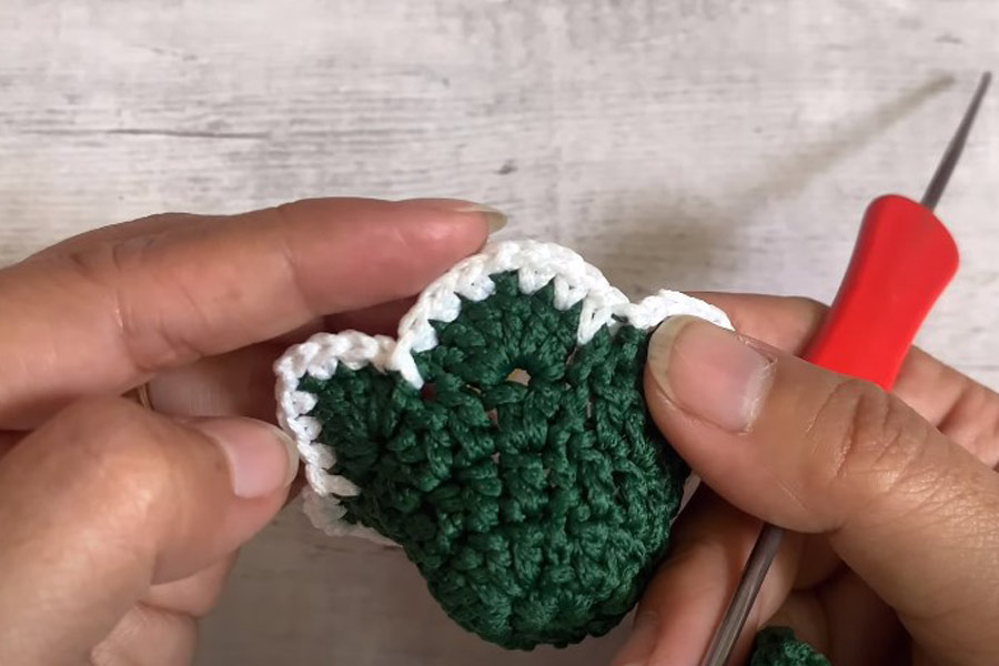 Bước 1: Dùng len màu xanh đậm móc thành từng miếng hình nón tròn làm tán cây thông. Các miếng có kích thước khác nhau, từ lớn đến nhỏ dần.