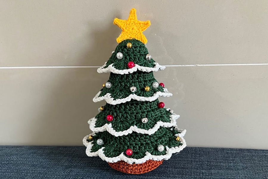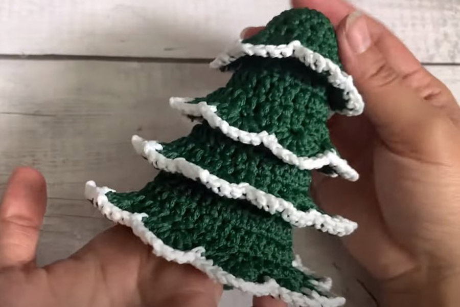 Bước 4: Lấy len màu trắng móc điểm xuyết lên tán cây thông giống như tuyết đọng trên lá.