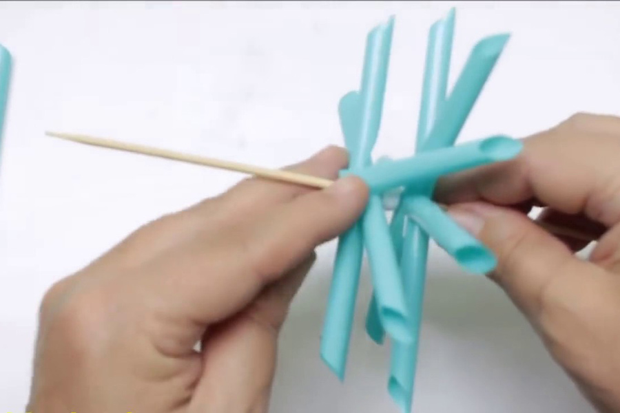 Bước 3: Xiên que gỗ vào ống hút, 3 ống hút bằng nhau thành 1 cụm, dùng keo dán cố định vị trí để ống hút không bị xê dịch. Cứ làm lần lượt như vậy, càng lên gần chóp là các ống hút càng ngắn dần.