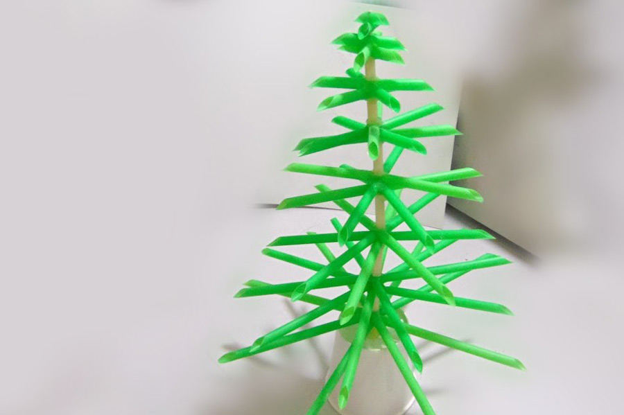 Cây thông Noel bằng ống hút làm rất đơn giản. Bạn có thể chuẩn bị thêm một ít hạt xốp gắn lên giống như tuyết đọng trên thân cây thông.