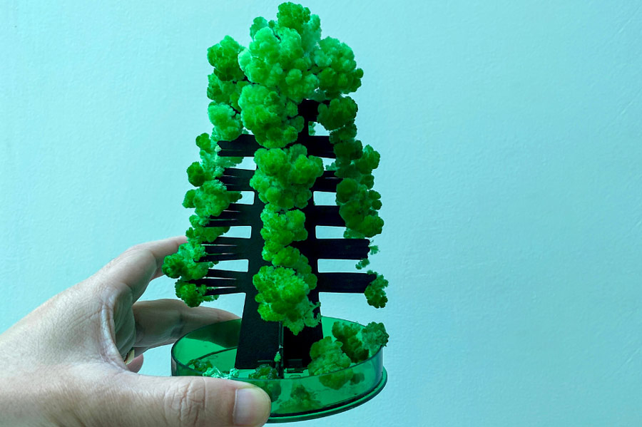 Bước 4: Đặt cây thông Noel vào dung dịch này qua đêm. Phần thân cây thông bằng giấy sẽ hút nước lên, quá trình các chất hóa học phản ứng với nhau sẽ tạo thành hiện tượng hoa tuyết nở trên cây thông.