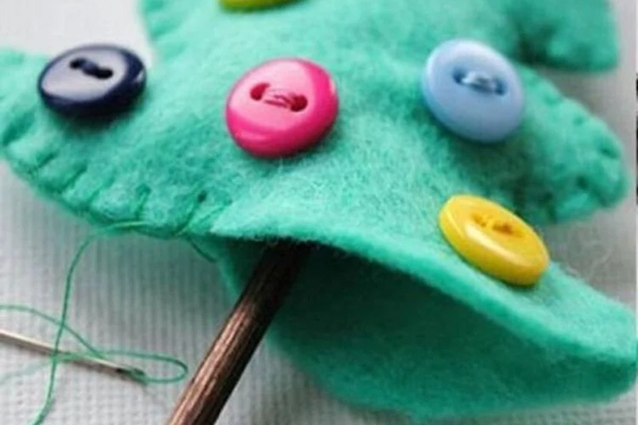 Bước 6: Gắn cúc áo lên trang trí cây thông.