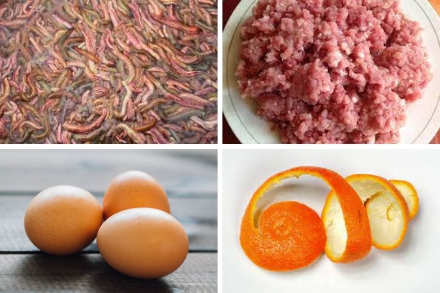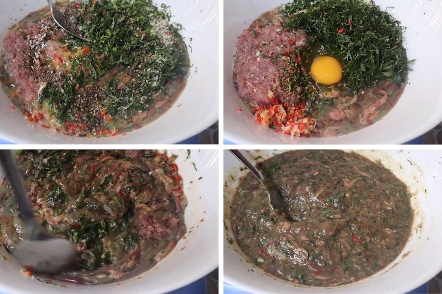 - Tiếp đến cho 3 quả trứng, thịt xay và các loại rau, vỏ quýt, ớt cắt nhỏ vào tô rươi và đánh tan trứng cùng hỗn hợp.