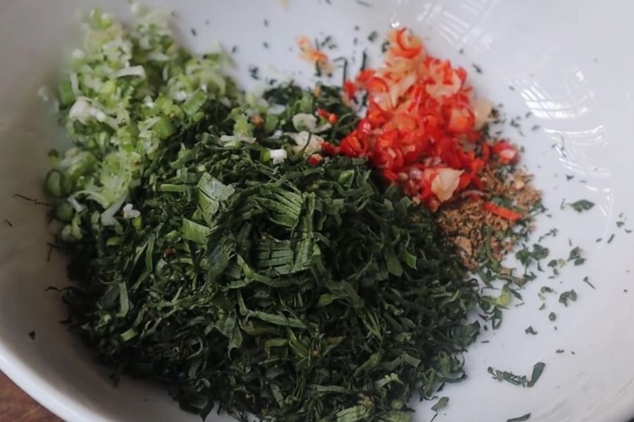 Hành lá, thì là, lá gừng, lá lốt và vỏ quýt thì bạn rửa sạch, để cho ráo nước rồi băm thật nhỏ.