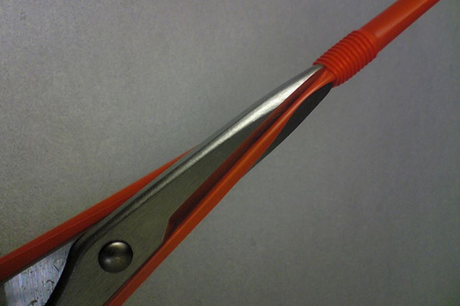Bước 3: Cắt theo cạnh được ấn dẹp ở bước 2 và cắt đến phần lò xo kéo dài thì dừng lại.