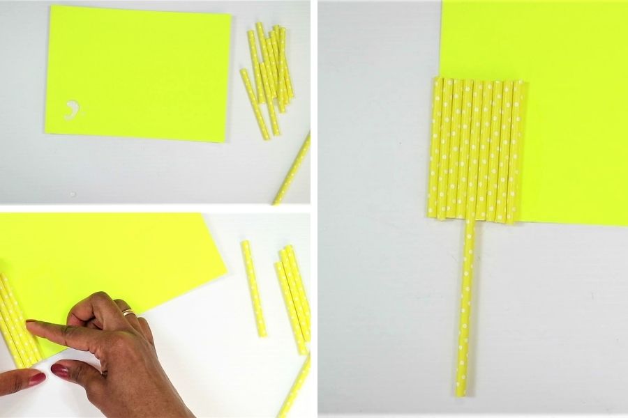Bước 2: Cho một ít keo lên tờ bìa, sau đó dán các đoạn ống hút giấy ngắn lên tờ giấy, thẳng hàng với nhau và ống hút dài dán vị trí ở giữa (đợi vài phút để keo khô lại nhé)
