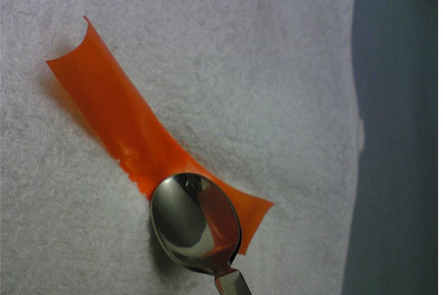 Đặt miếng đã cắt lên một chiếc khăn đã gấp và dùng thìa làm phẳng nó. Sau đó gấp nó lại thêm một lần nữa.