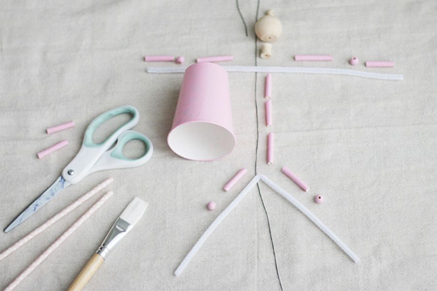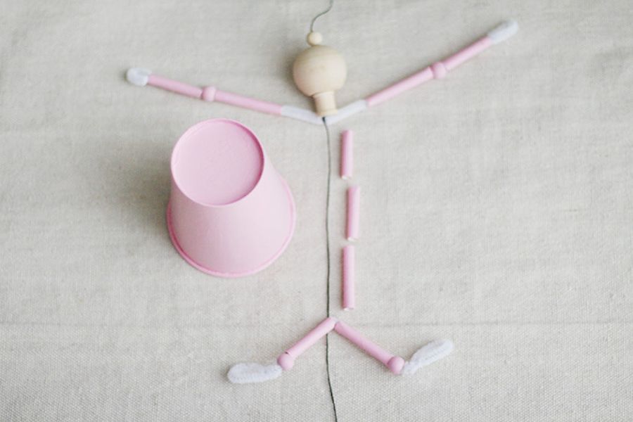 Đối với đầu và cổ, bạn xâu dây vào các hạt gỗ và buộc dây vào cánh tay. Sau đó chọc một lỗ vào đỉnh cốc giấy và luồn vào dây. Cuối cùng, bạn luồn ba ống hút vào dây để tạo thành thân (những thứ này sẽ được giấu chủ yếu dưới cốc) và buộc dây vào chân.
