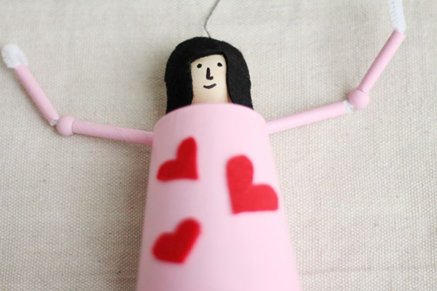 Bước 3: Bạn hãy trang trí con rối với trái tim bằng vải nỉ màu đỏ trên cốc và cắt miếng vải nỉ đen làm tóc sau đó dán lên hạt gỗ ở phần đầu. Sau đó sử dụng bút dạ màu đen để vẽ trên khuôn mặt.