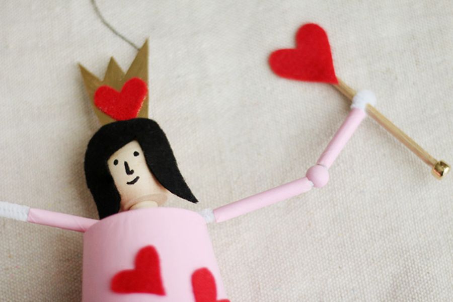 Bước 4: Bạn cắt một vương miện từ tấm card màu vàng và dán một trái tim màu đỏ lên. Sau đó dán vương miện lên đầu con rối.