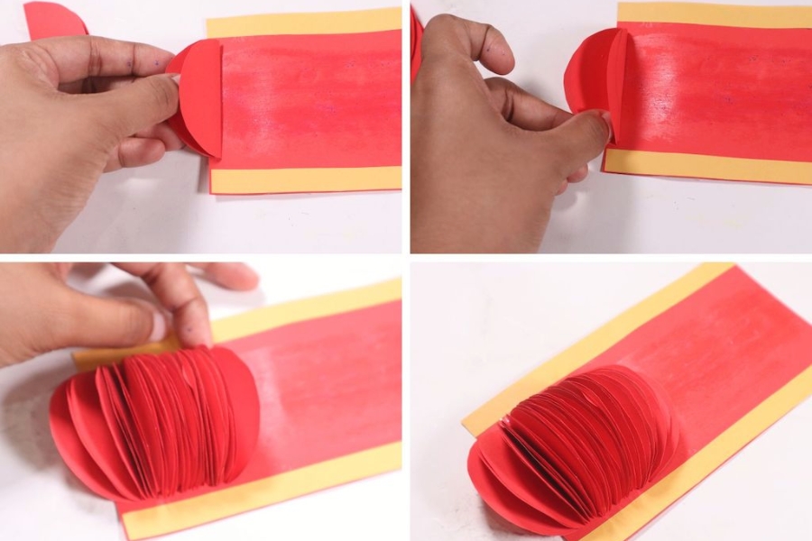 - Bước 3: Mở một hình quạt ra, dùng keo sữa bôi vào hai mép ngoài và đường gấp giữa. Gấp hình quạt lại, dán chặt hai mép. Lặp lại với các hình quạt còn lại.