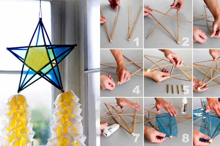 - Bước 3: Dùng 5 thanh tre ngắn làm trụ, cắm vào các điểm giao nhau của hai ngôi sao để tạo thành hình lồng đèn. Cố định chắc chắn bằng dây kẽm.