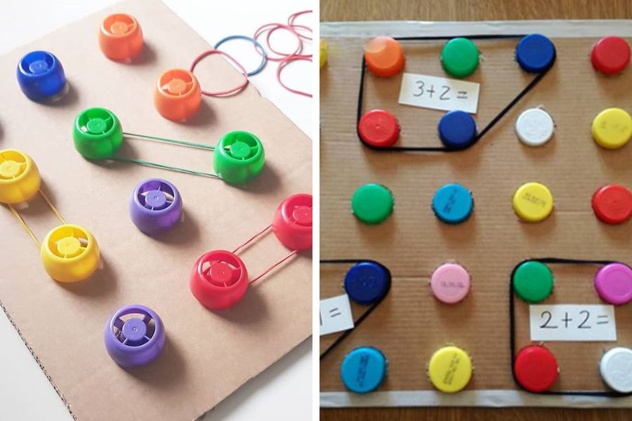 Hướng dẫn chơi đồ chơi tính toán bằng nắp chai như sau: Bạn dính những mảnh giấy ghi phép tính lên bảng và bảo bé dùng dây chun vòng vào các nắp chai. Lưu ý rằng số lượng nắp phải bằng với kết quả của phép toán đó.
