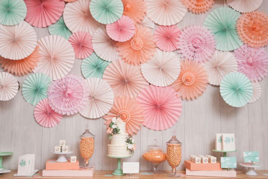 Ngoài ra, gấp quạt giấy để trang trí tường cũng là một ý tưởng đặc biệt. Tận dụng giấy màu ở nhà, bạn có thể gấp thành quạt giấy điểm xuyết thêm một vài bông hoa để trang trí.