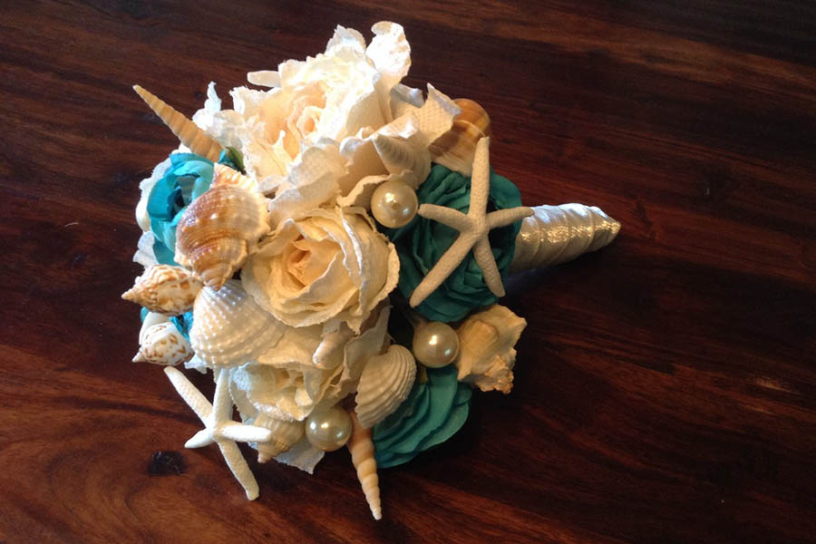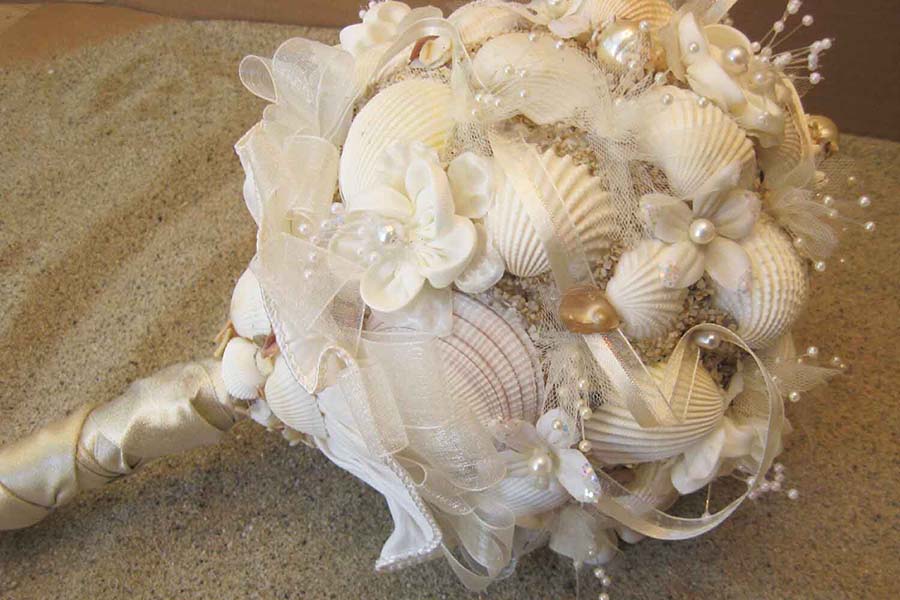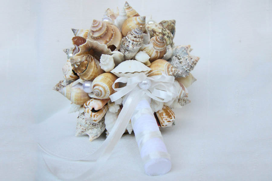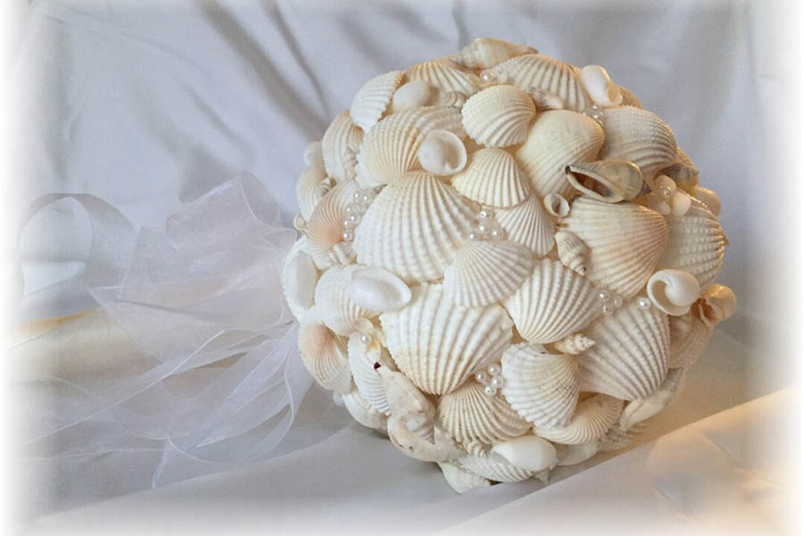 Bó hoa cưới bằng vỏ ngao, vỏ ốc được rất nhiều cặp đôi yêu thích. Cách làm bó hoa này cũng không quá phức tạp, chỉ cần chuẩn bị cuống hoa bằng nhựa, giấy gói, nơ là được.
