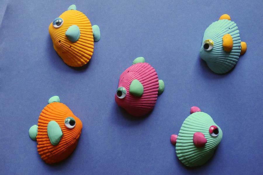 Ví dụ như làm con cá bằng vỏ ngao thì phụ huynh có thể chỉ bé tô màu vàng lên vỏ, vẽ thêm mắt, dùng vỏ loại ngao nhỏ làm đuôi, vây là xong.
