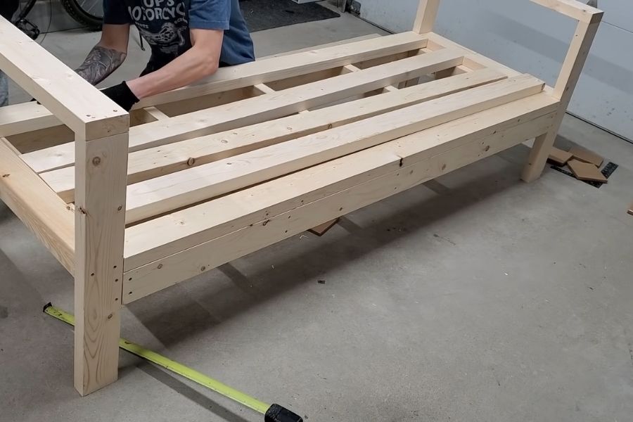- Lắp 7 thanh gỗ dài làm phần ghế ngồi. Bên cạnh đó chúng còn giúp bộ khung ghế sofa thêm phần cứng cáp và có thể chịu lực tốt.