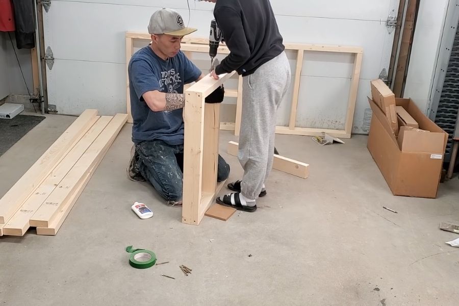 - Tiến hành dán keo cố định các mối nối, đóng đinh cố định 2 phần khung bên chân ghế. Bạn có thể sử dụng máy khoan để bắt vít nhanh và an toàn hơn.