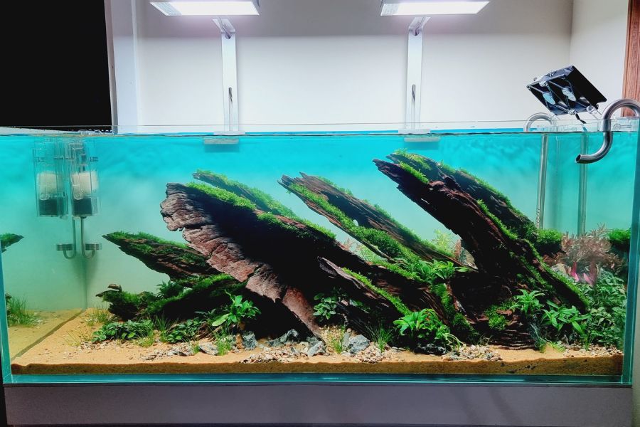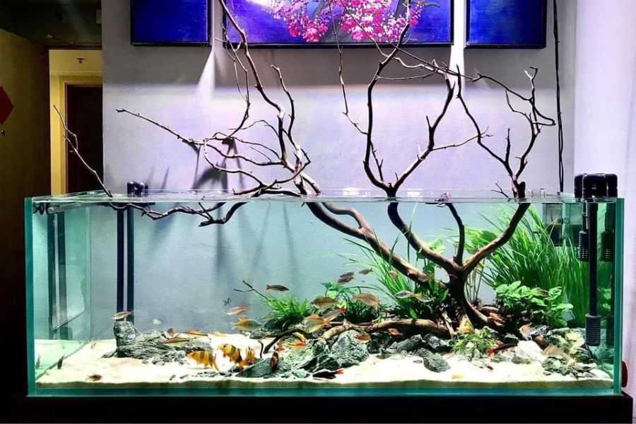 - Setup bố cục bằng các đặt trực tiếp lên hồ: Bạn có thể đặt đá, lũa, cây thủy sinh trực tiếp vào trong bể và sắp xếp bố cục theo ý muốn. Tính thẩm mỹ của hồ phụ thuộc khá nhiều vào khâu này nên bạn hãy cân nhắc để sắp xếp sao cho hài hòa nhất nhé!