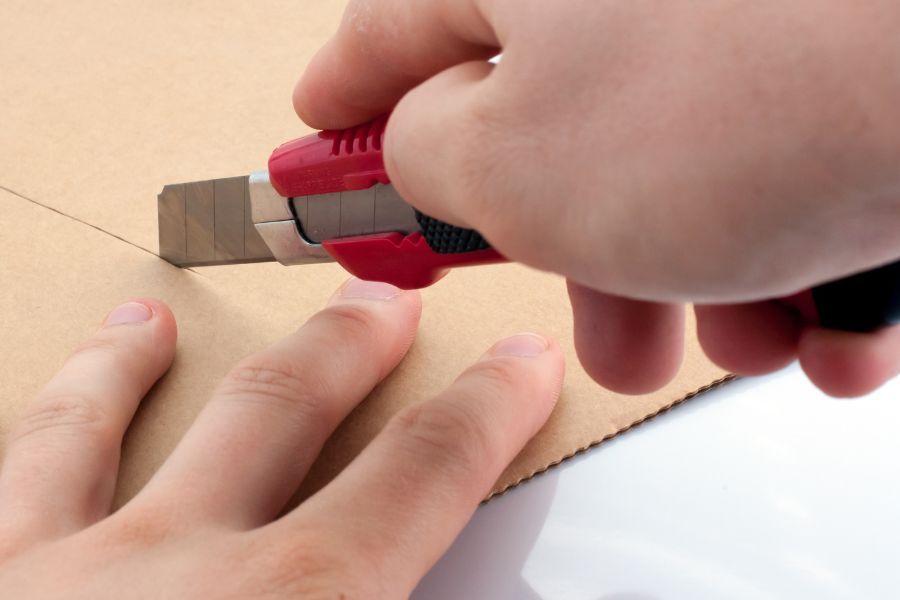 Lấy thùng bìa carton cứng đã chuẩn bị, cắt bỏ phần bên trên và phần đáy của thùng. Tách phần bìa bao quanh thùng giấy thành 1 dải bìa thẳng.