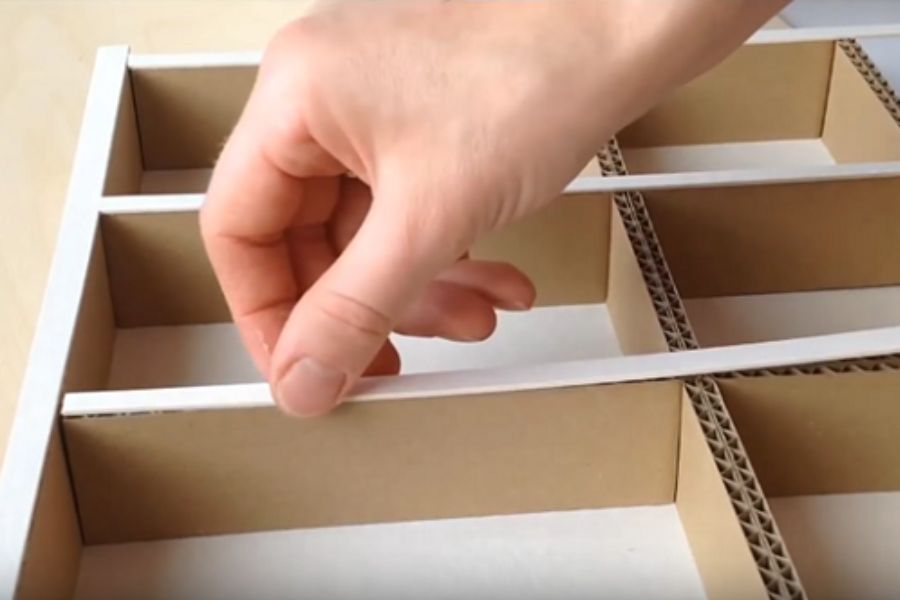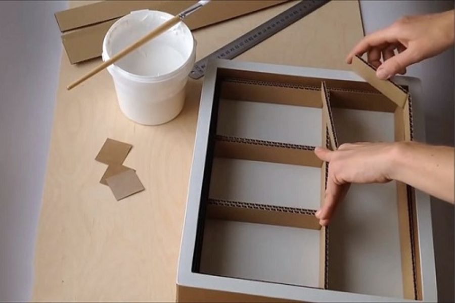 Cắt 2 tấm bìa to để làm mặt đáy là nắp của kệ. Chuẩn bị thêm 2 – 3 tấm bìa để chia bố cục bên trọng của kệ thành các ngăn nhỏ.