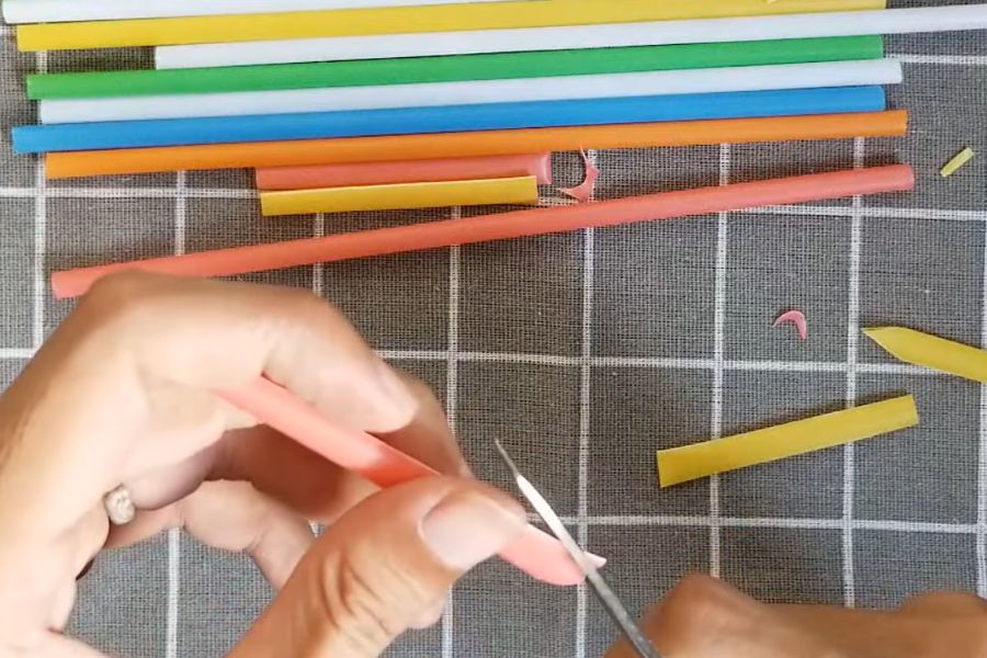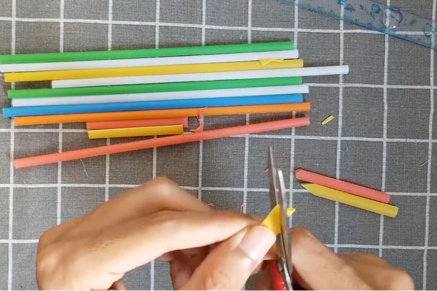 Bước 3: Cắt ống hút thành hình mũi nhọn sau đó dùng thước vuốt dẹp ống hút lại một lần nữa.