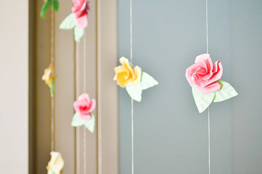 Bạn lấy sợi chỉ nối những hình đã làm lại sau đó treo lên khung rèm đã chuẩn bị sẵn là hoàn tất. Hãy chỉnh các sợi màn có khoảng cách nhất định, tránh trường hợp các dây bị quấn vào nhau.