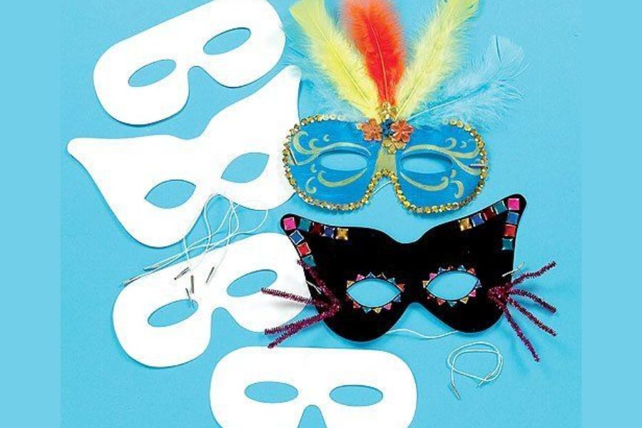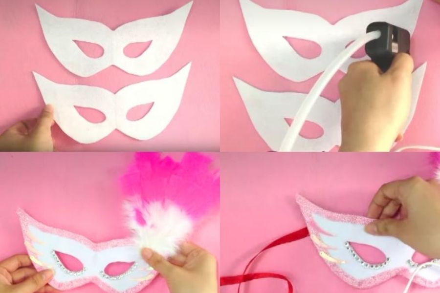 - Đính kèm phụ kiện: Bạn có thể dán thêm các phụ kiện trang trí như ruy băng, lông vũ,… hay râu giả, lông mi giả, hay gắn thêm đồ trang sức bí ẩn để làm cho mặt nạ đáng sợ và thêm phần thu hút hơn.