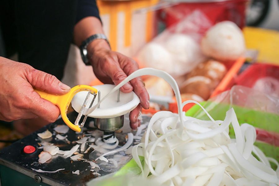 – Dừa: Rửa và làm sạch lớp vỏ bám bên ngoài, để dừa thành những miếng to để khi bào sợi không bị vụn. Để đều tay thì bạn nên sử dụng dao bào như vậy sợi được dài và đều trông sẽ đẹp mắt hơn. Dừa bào mỏng thì sẽ dễ thấm đường, ngọt và ngon hơn.