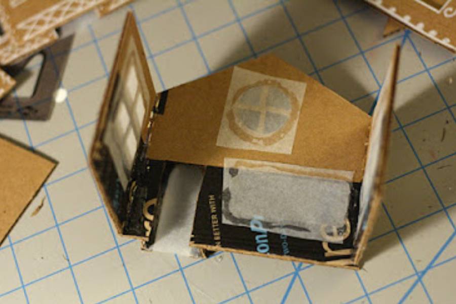 Bước 6: Dán ráp 2 tấm tường hai bên với mặt trước của bức tường bằng súng bắn keo, rồi dán tấm bìa mặt sau đó vào ngôi nhà. Cuối cùng, cắt bìa carton thành 2 tấm hình chữ nhật rồi dán lên phía mái nhà.