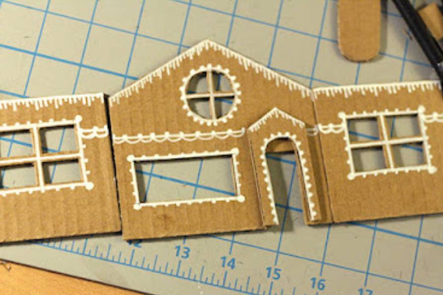 Bước 3: Sử dụng bút màu trắng để vẽ trang trí viền tường, từ đó làm mặt trước của ngôi nhà. Cũng tương tự bạn cần cắt tấm bìa carton có cùng kích thước để làm phần mặt sau của ngôi nhà.