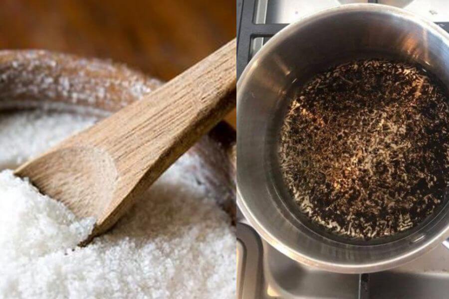 - Bạn hãy rắc lên bề mặt vết cháy một chút muối. Sau đó bạn cho vào một chút giấm và ngâm trong vòng 10 – 15 phút.