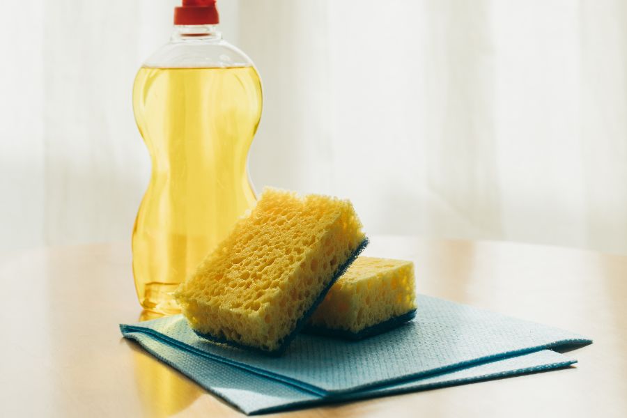 - Bước 2: Bạn đợi nước nguội, dùng nước rửa bát và miếng bọt biển để chà sạch các vết cháy này.