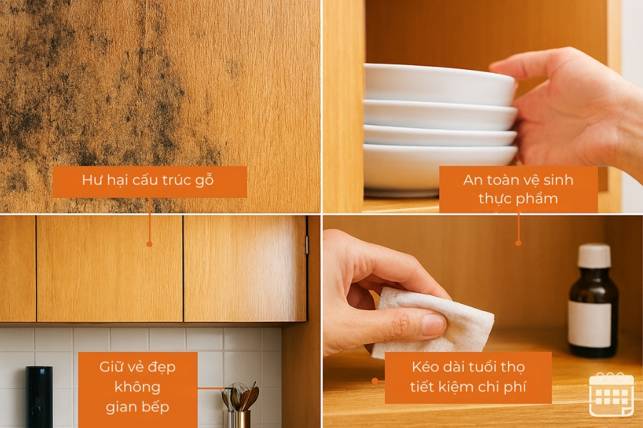 Gỗ là chất liệu tự nhiên, nhạy cảm với độ ẩm và dầu mỡ hơn bề mặt nhựa hay kim loại. Khi bỏ qua việc vệ sinh định kỳ, bạn đang vô tình rút ngắn tuổi thọ của tủ bếp.