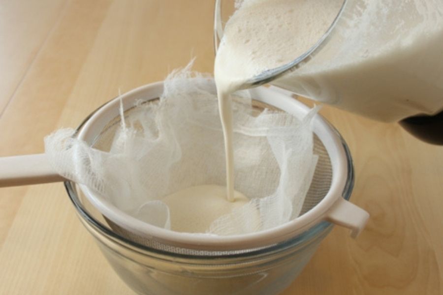 Đợi sữa hơi nguội thì tiến hành lọc sữa. Dùng rây để lọc sạch phần bã gạo, rồi cho 80gr đường, 50gr sữa đặc và 10gr vani vào khuấy đều. Có thể thêm bớt các loại gia vị để phù hợp với khẩu vị gia đình nhé.