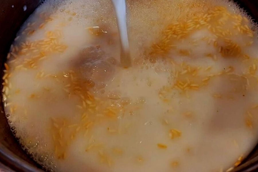 Cho 850ml nước lạnh đã chuẩn bị vào nấu trên bếp. Khi nước sôi cho tiếp phần gạo rang và sữa tươi không đường vào, và tắt bếp. Để gạo ngâm khoảng nửa tiếng rồi mới bắt đầu nấu.