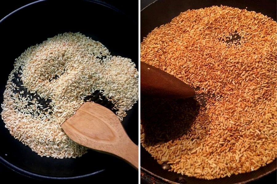 Thấy gạo khô lại, thì hạ lửa xuống mức thấp nhất, tiếp tục rang khoảng 15 – 20 phút nữa. Tắt bếp khi gạo vàng đều, có mùi thơm nhẹ.