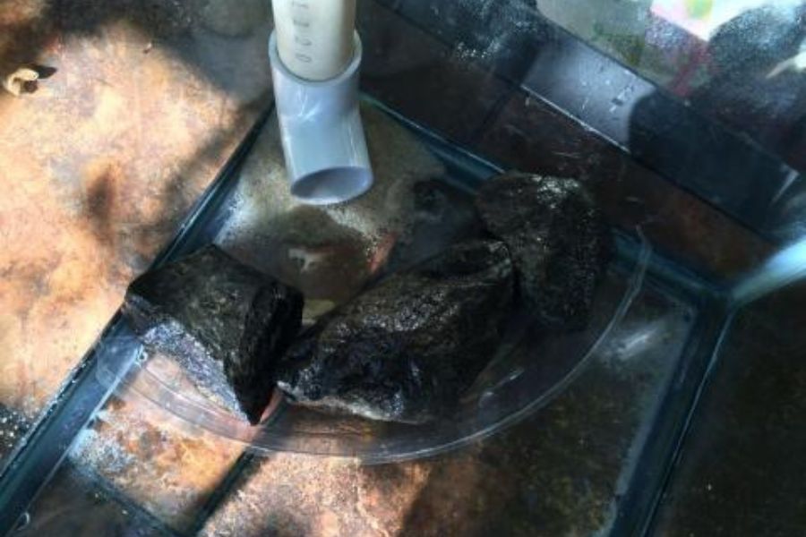 Bước 3: Chúng ta sẽ dùng kéo hoặc bẻ sao cho đĩa nhựa sẽ nằm gọn trong 1 góc, để số lượng cát sẽ không vương vãi ra ngoài đáy hồ. Sau đó chèn 1 số đá để che đĩa nhựa lại và chống đất nền tràn vào đĩa cát của chúng ta.