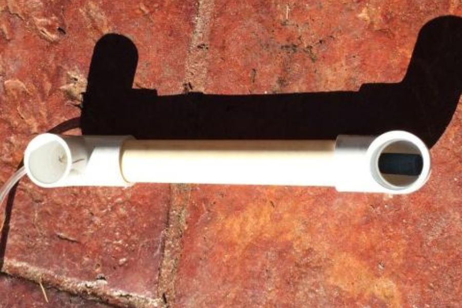 Bước 1: Khoan 1 lỗ trên co ống, để luồn dây oxy vào, nhìn sẽ rất gọn và cát sẽ dễ dàng đi qua hơn là luồng qua đường cong của co ống.