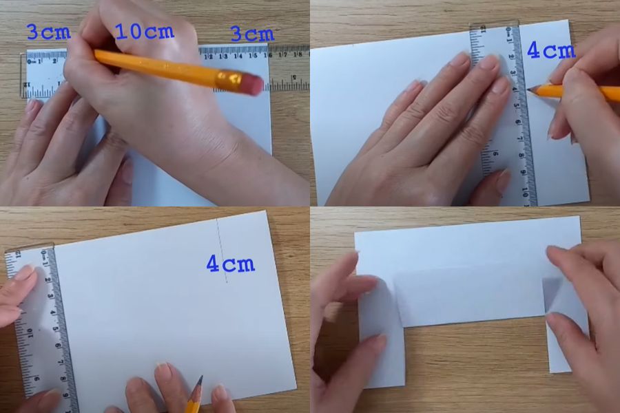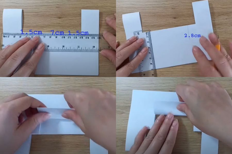 Bước 3: Dùng thước chia tiếp phần giữa của giấy kích thước như hình minh họa. Làm lần lượt theo ảnh.