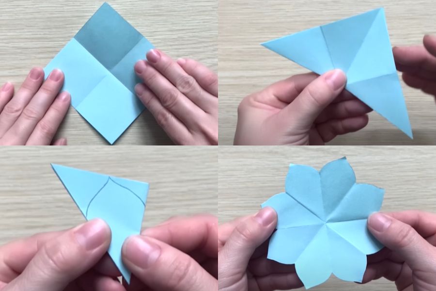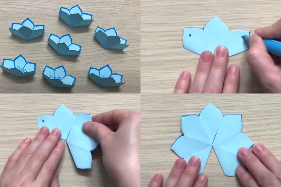 Bước 8: Dùng giấy xanh nhạt kích thước 9cm x 9cm gấp theo hình minh họa. Sau đó dùng bút vẽ hình cánh hoa rồi cắt theo đường vẽ sẽ được bông hoa.