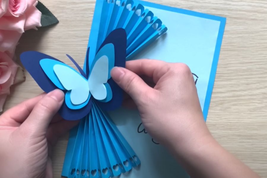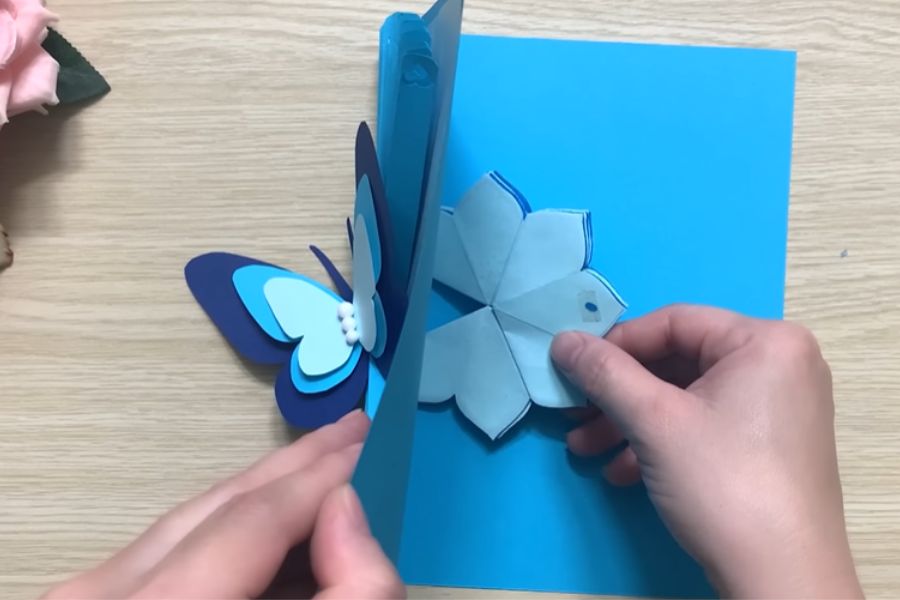 Bước 12: Dán băng dính hai mặt vào hai bên của phần hoa rồi cố định vào giữa thiệp, làm chắc tay để hoa được giữ chặt bên trong thiệp.