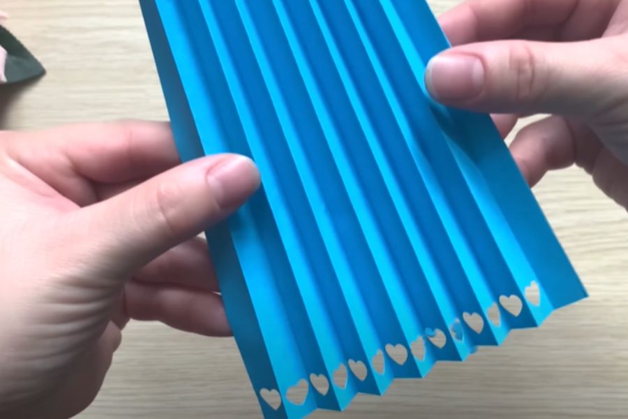 Bước 2: Sau khi gấp xong hình quạt dùng ghim bấm tạo kiểu hình trái tim để được như hình minh họa.
