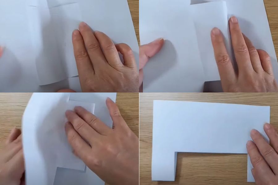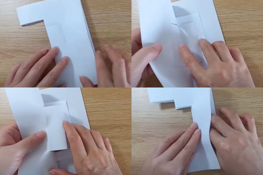 Bước 2: Mở đôi tờ giấy, sau đó dùng tay đẩy phần đã cắt vào phía bên trong rồi gấp lại. Làm theo từng bước như hình ảnh.