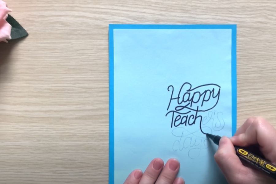 Bước 3: Lấy một giấy xanh đậm 20cm x 28cm gấp đôi rồi dùng một giấy xanh nhạt 19cm x 13cm bôi keo lên mặt sau của giấy. Sau đó dán lên giấy xanh đậm. Dùng bút dạ viết dòng chữ Happy Teacher’s Day lên thiệp.