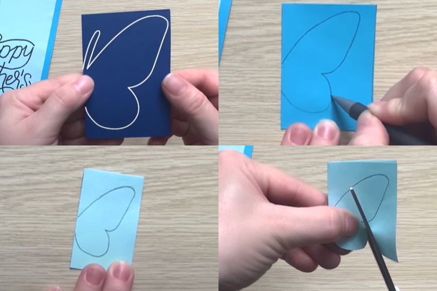 Bước 5: Dùng một giấy xanh navy, xanh đậm và xanh nhạt kích thước lần lượt là 12cm x 9cm, 10cm x 7cm, 7cm x 6cm. Gấp đôi lại rồi dùng bút vẽ hình cánh bướm như ảnh rồi dùng kéo cắt theo đường vẽ.