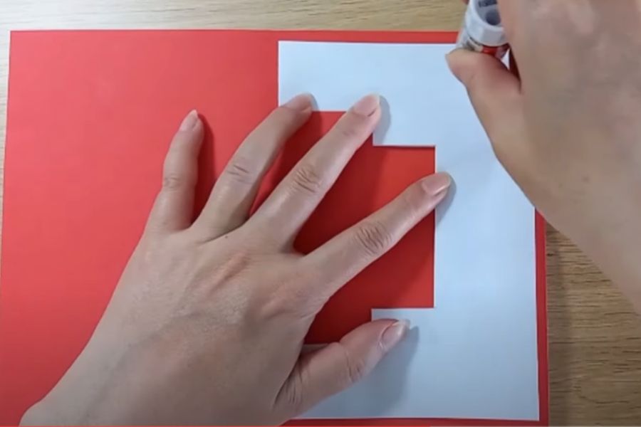 Bước 5: Lấy 1 giấy màu đỏ kích thước 23cm x 17cm gấp đôi lại, đặt giấy màu trắng vào giữa như hình. Dùng kéo dán lên một bên của giấy trắng rồi dính vào giấy màu đỏ, làm tương tự với mặt bên kia của giấy sau đó cố định chặt lại.