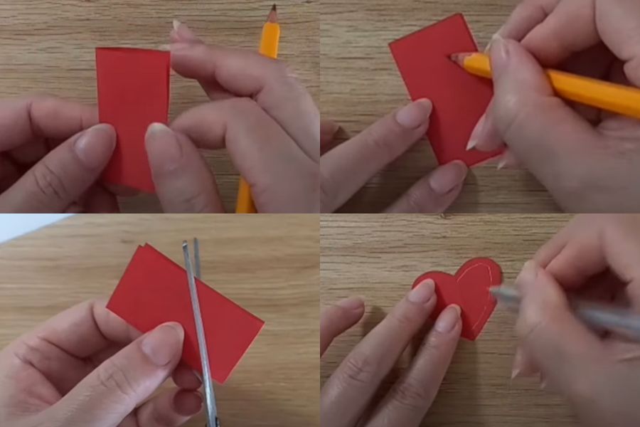 Bước 7: Chuẩn bị giấy ô vuông màu đỏ kích thước tùy thích, gấp đôi sau đó lấy bút vẽ một nửa hình trái tim rồi dùng kéo cắt theo đường vẽ. Trang trí lên hình trái tim theo sở thích của bạn.